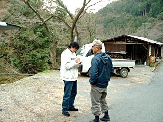 熊本県八代市より市民の会の穂田昭徳さんが来訪。渓流釣りを楽しんだ。写真は地元の方に熱心に質問する穂田さん